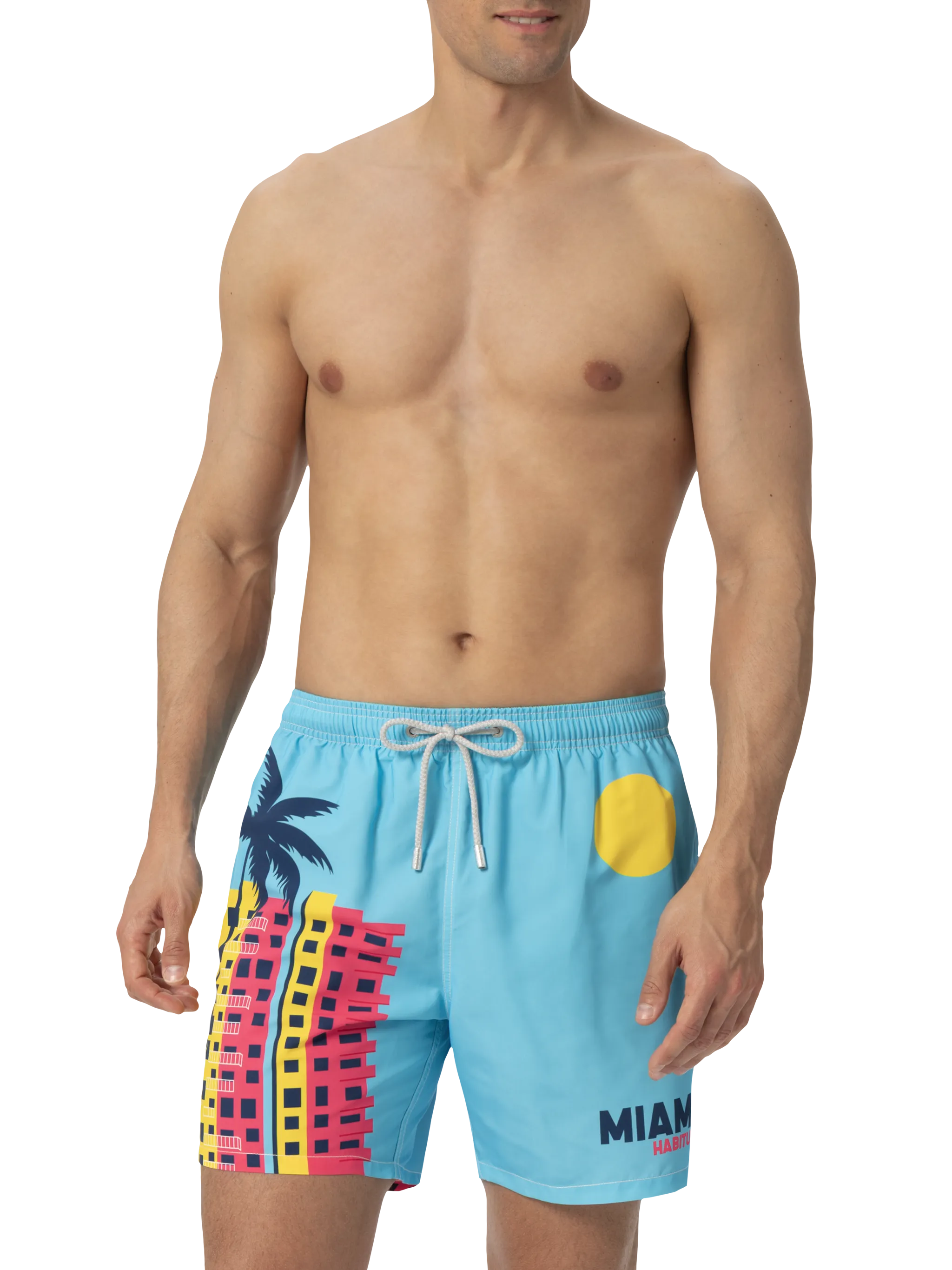 Mid-length Gustavia swim-shorts with Miami postcard placed print—